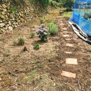 花畑とブルーベリーの間にレンガで小道を作りました。