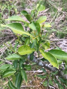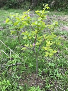 最後に私の期待を背負って農地に植えられた太秋柿の様子を見ておきましょう。2本の苗はどちらも若葉がいっぱい出てとても元気な様子で安心しました。昨年買った2本はほぼ同じ大きさに思えましたが、今日は枝の太さや新芽の出かたも違っていて個性のようなものを感じます。