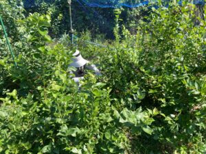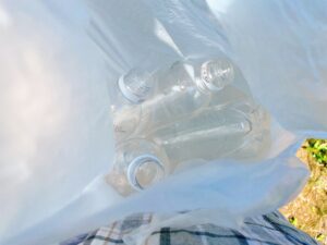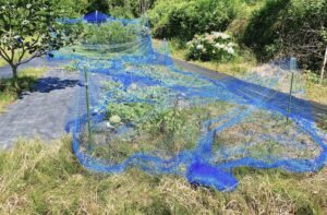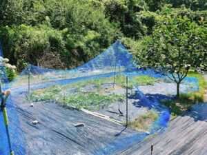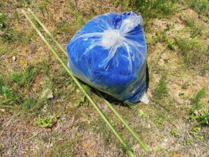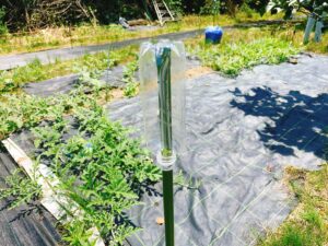 去年のスイカ畑で使用したネットと支柱、使用済みのペットボトル4個です。