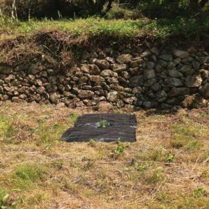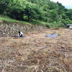 花畑の場所に選んだのは梅の木が並ぶ石垣の傍です。(写真の夫がいる辺り)ここに決めた理由は成長した果樹たちを眺めるのに丁度いいと思ったからです。私の頭の中にはベンチを置けばお花に囲まれてランチやティータイムも楽しめる✨といった未来予想図が浮かんでいました。