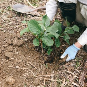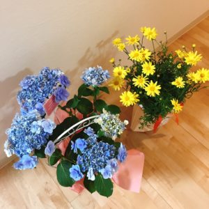 母の日に息子夫婦からもらったアジサイとマーガレットを農地に植えました。