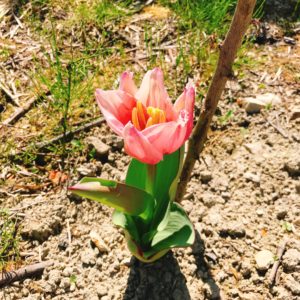 一気に暖かくなった農地では次々と花が咲き始め、既に芽が出ていたチューリップも無事花を咲かせています。