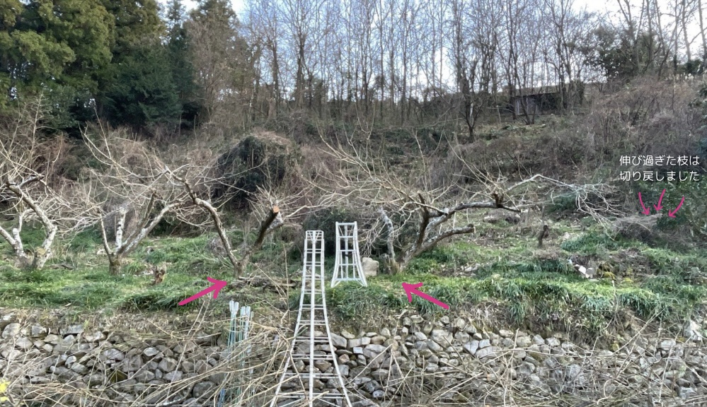 - 長く外に張り出した枝は、防鳥ネットを掛けた際に隙間をつくる原因になるので、コンパクトになるよう短くしました。