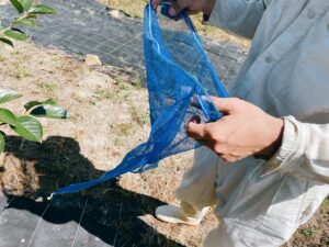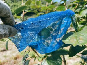 - 残る3個を死守するため柿に害獣対策のネット掛けをする