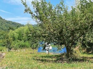 夫がスタスタと容赦なくブルーベリーがある害獣対策の場所に近づきます。