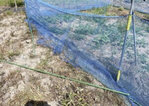 もともと張ってある防鳥ネットの裾部分を園芸用支柱でしっかりと塞いで地面と固定しておきました。ハクビシン程度の小動物には絶対持ち上げられないくらいの強度があります。
