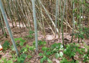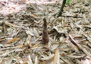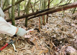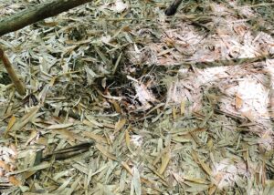 竹藪にはイノシシが掘って食べた跡があちこちに残っています。
