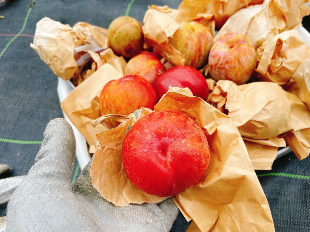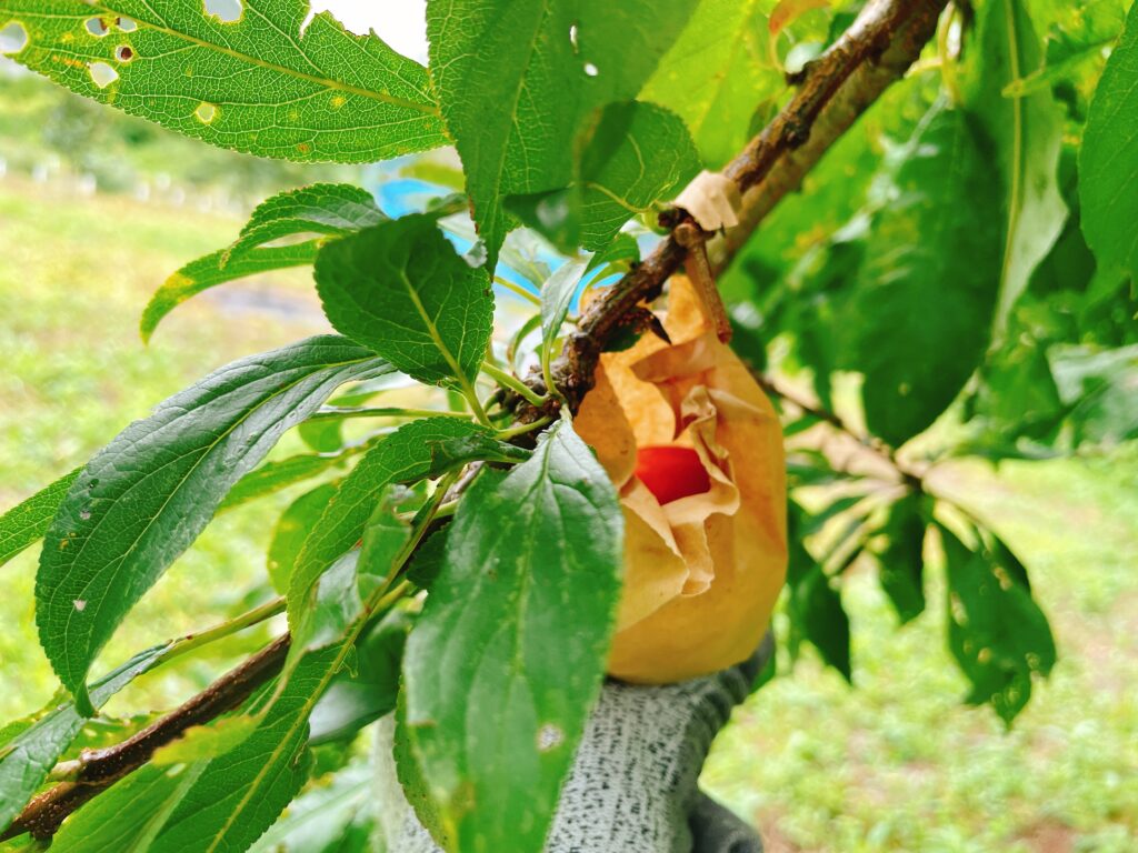 なんと!熟して地面に落ちる運命だったスモモを果実袋がキャッチしているのです😲✨