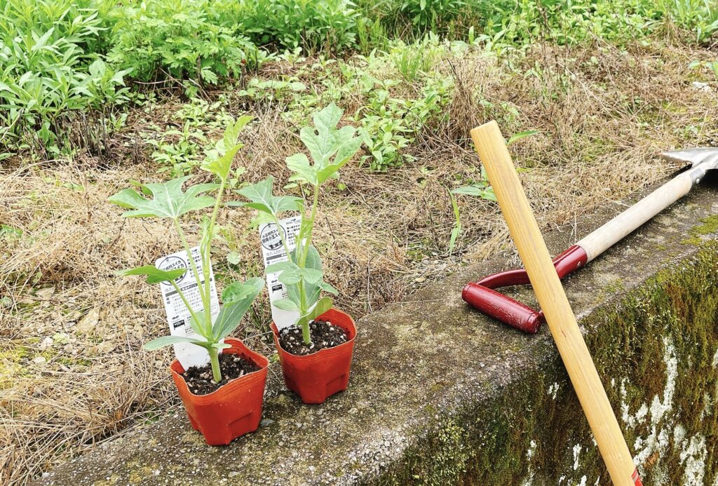 先日の農地訪問の際に2本の秋味小玉スイカの苗を植えました。
