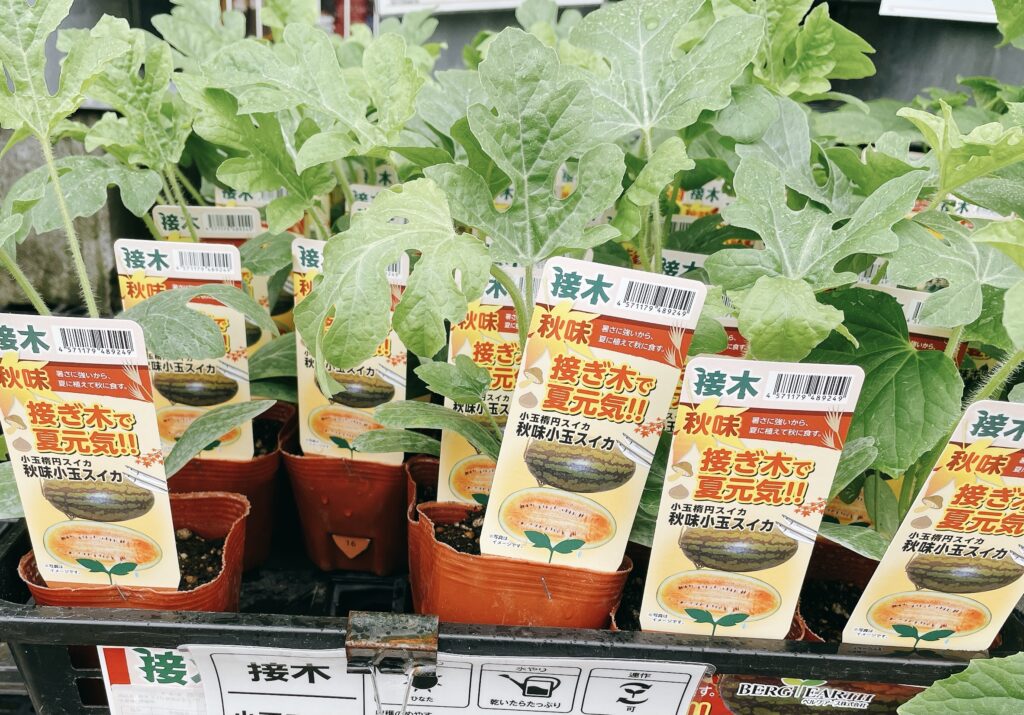 今年は無理だと残念がっていたら、6月半ばに「秋味小玉スイカ」というスイカの苗が並んでました✨