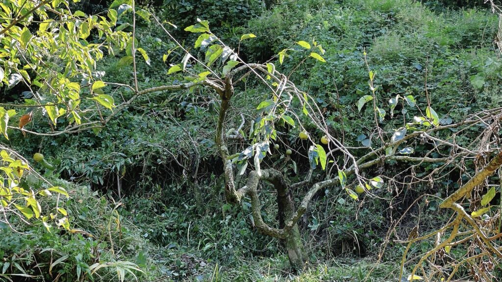 ツタと雑草に覆われて存在が隠れてた柿の木が
