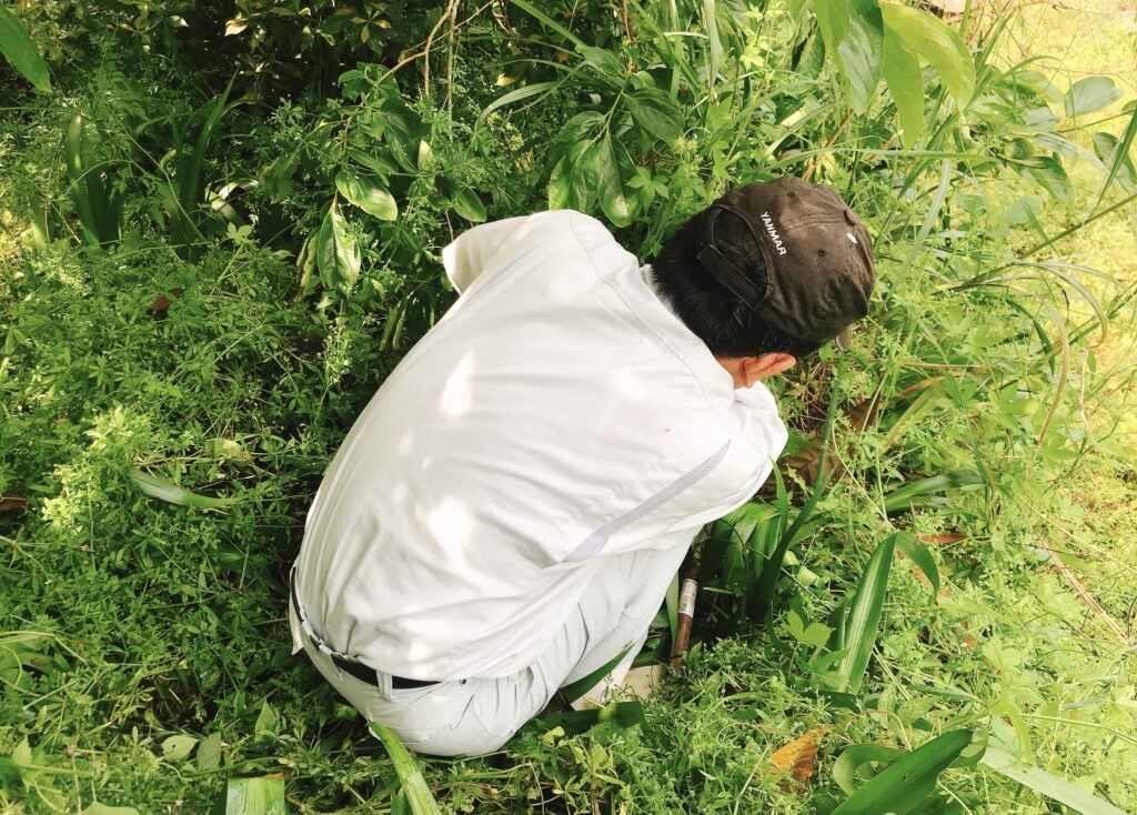 崖っぷちの藪の中にかくれている野イチゴを見つけて必死に手を伸ばしてくれている夫。