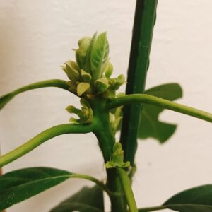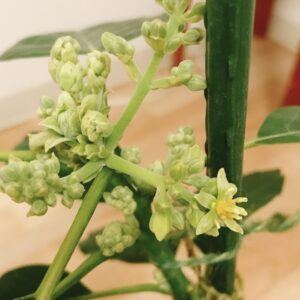 昨年の秋に頂いたアボカドの苗を部屋で冬越しさせていたら花が咲き始めました!