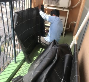 朝早くからベランダで昨日ホームセンターで購入した防草シートをカットする夫。今日は大仕事の一日になりそうです。