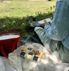 先日農地を案内してくれた叔父が教えてくれた梅の木の木陰でお昼を食べたくて、お弁当を作りました。お天気にも恵まれてとても気持ちのいいランチタイムが実現しました。