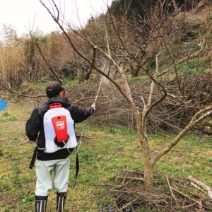 ふくろみ病対策には12~2月に石灰硫黄合剤を散布する方法があるそうですが、今回はスモモに効果がありそうな別の農薬を散布しました。