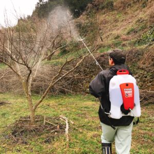 農薬の風向きに気を付けながら2本のスモモに満遍なく散布します。