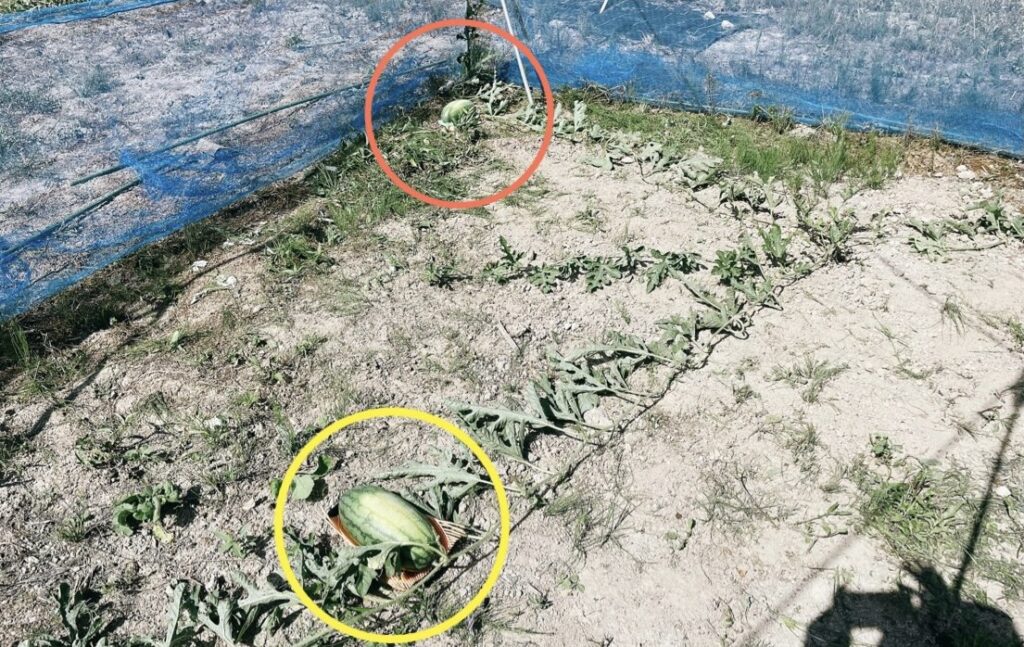 その証拠にスイカが実った場所から何メートルも離れた場所で食べかけのスイカの残骸が転がってました 😩