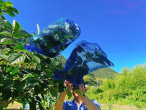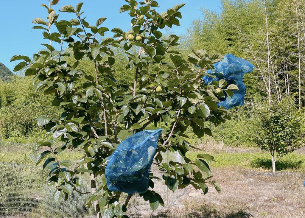 去年と同様に柿の実を包むようにネットを掛けて害獣対策をしました。