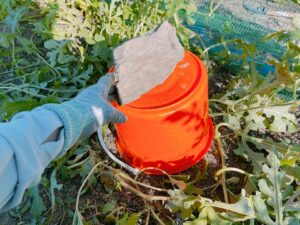 ネットの壁を這うように実っていたのを引き剥がし、バケツで隠しておきます。