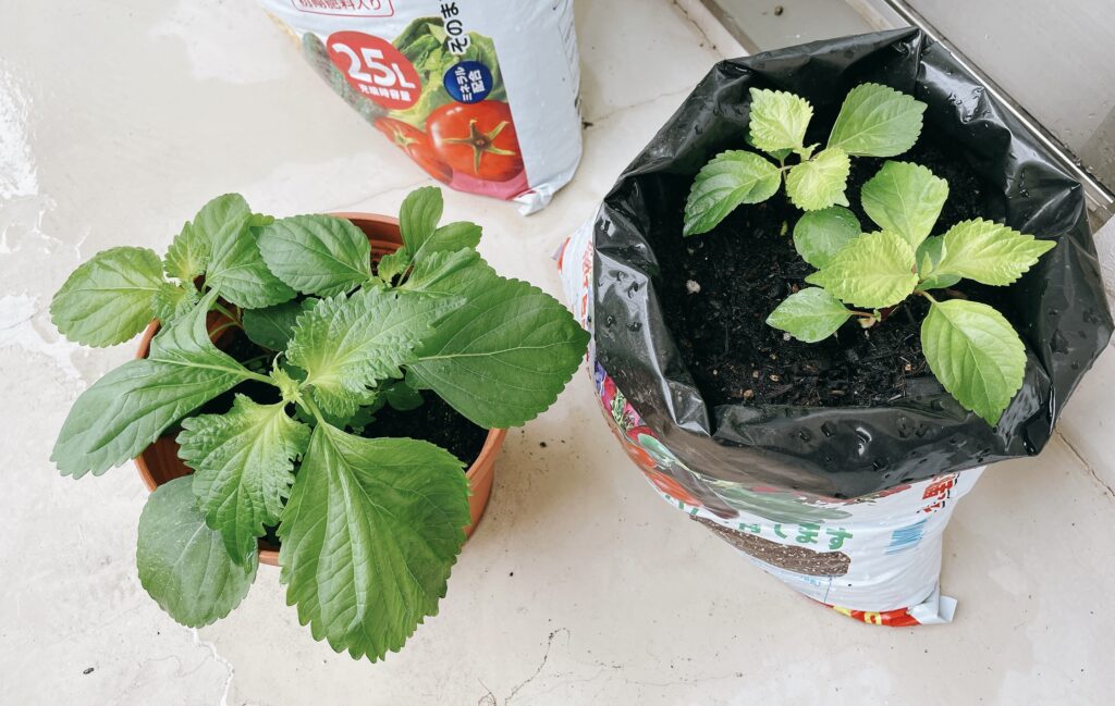 元の鉢には同じ大きさに成長した青じそが3本あり、うち2本を新しい培養土に植え替えました。