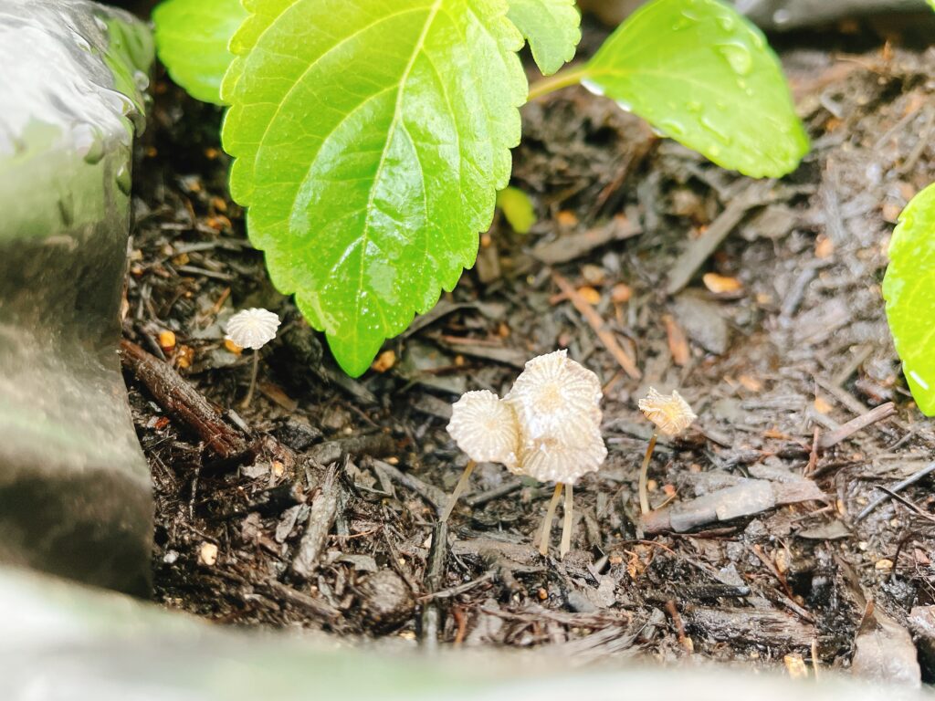 青じそを植え替えた培養土に小さなキノコがいっぱい生えてます😲