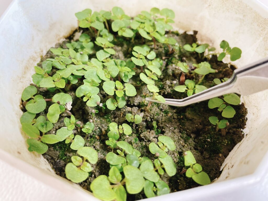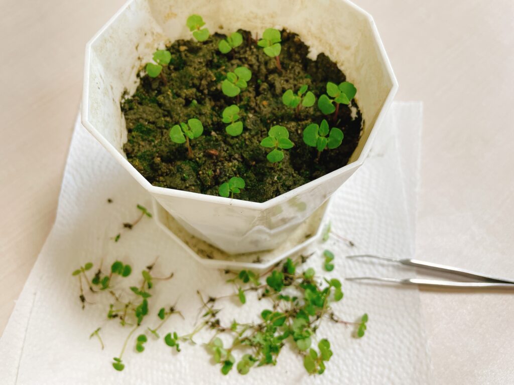 適当に蒔いてかなり密集した状態なので間引きをします。