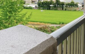 ベランダに出ると青々とした田んぼの上空を飛ぶヘリコプターとそれを見守る作業服の男性がひとり見えます👀