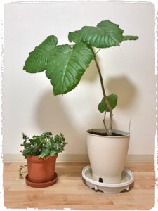今回は私が連れてきた植物3つ(フィカス・ウンベラータ/アイビー/フィカス・プミラ)を植え替えします。特にずっと気になってるのが「フィカス・ウンベラータ」です。※写真左上の植物