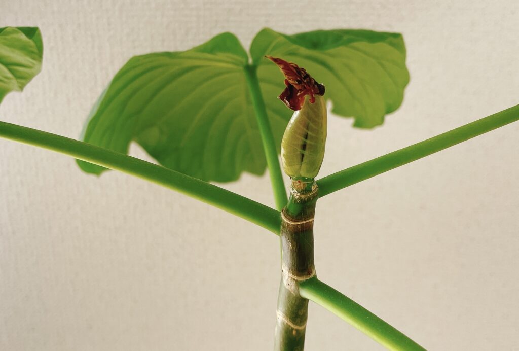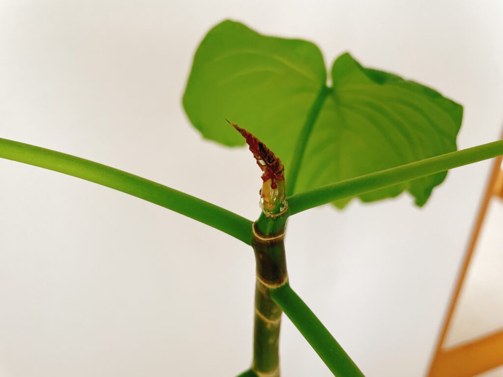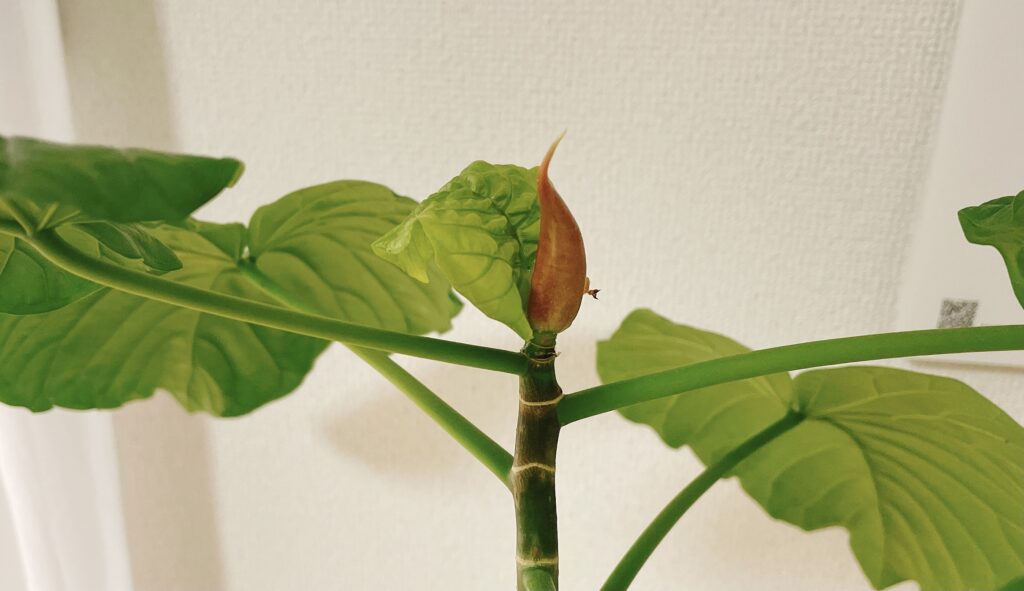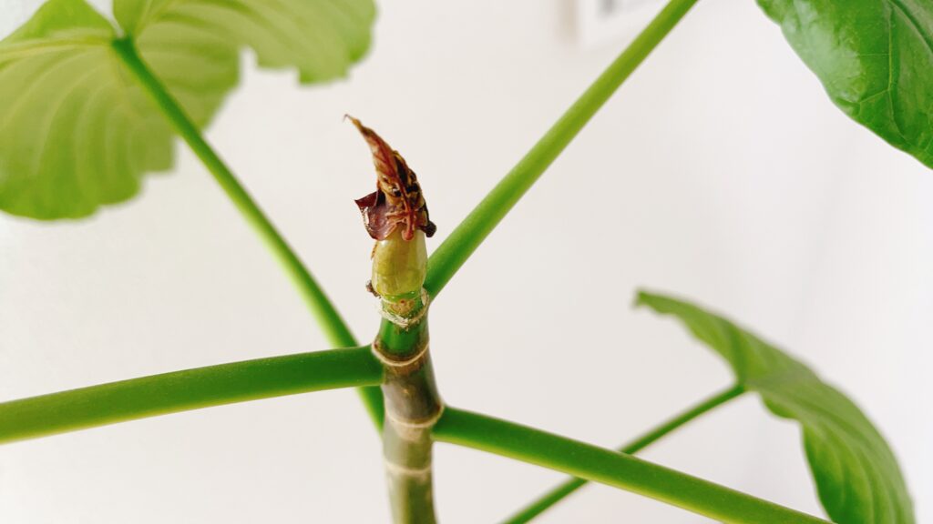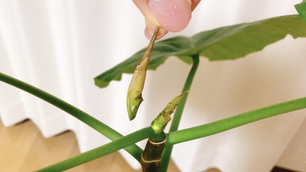 私の不注意で折ってしまった芽ですが、正しくはポキッっと折れたと思ったのは新芽を覆っている外側の皮の部分で同時に中の幼い葉も傷めてしまったという状況です。
