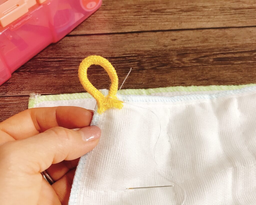 使い勝手をよくするためにふきんの端っこにかけ紐を取り付けます♪