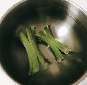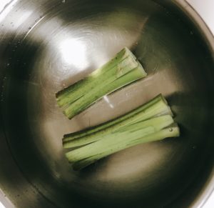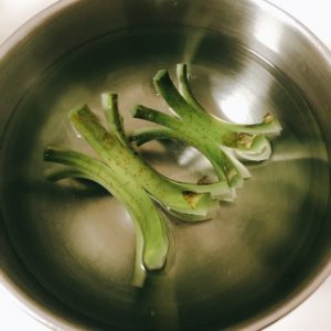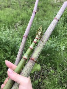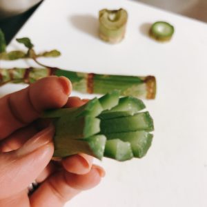 ①好みの長さに切ってイタドリの断面に放射線状に切れ目を入れる