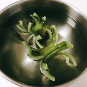 持って帰ったイタドリを昨晩「水車」の細工を施して水に浸けておきました。水車を作る際のコツは「放射線状の切れ目は細かいほどくるっと激しく曲がる」です。
