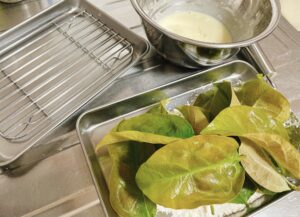 - 柿の葉を天ぷら粉にくぐらせて揚げる