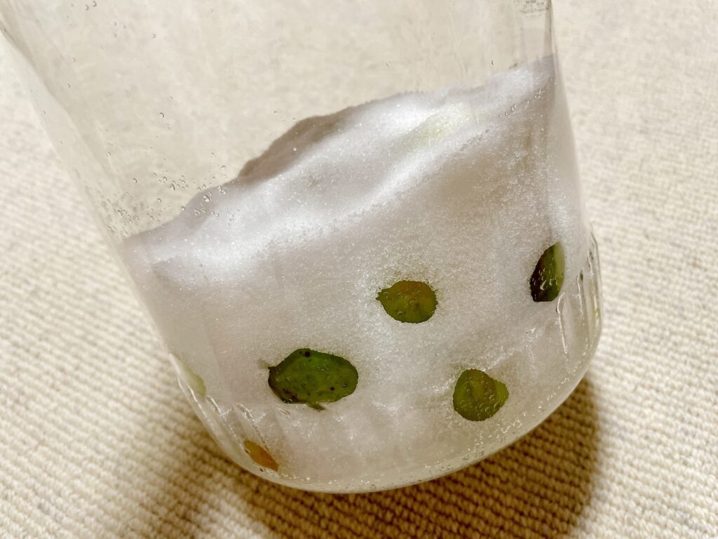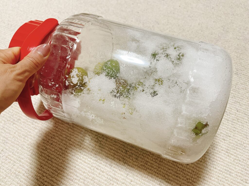 梅ジュースではこのような注意点があるので「瓶を混ぜずに暫く砂糖に浸けたまま」にしてみることにしました。