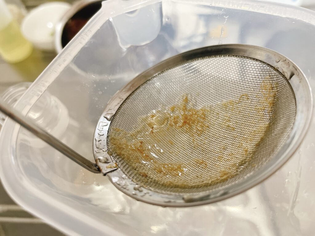 先ずは目の細かい網を使ってみましたがこんな感じで溶けた梅の実の繊維が残ってます。