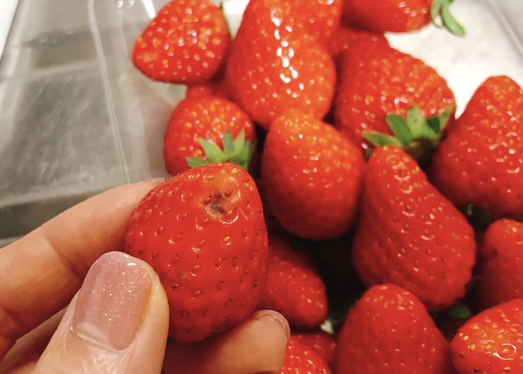 イチゴを洗ってカビの生えているところを丁寧に取っていきます。