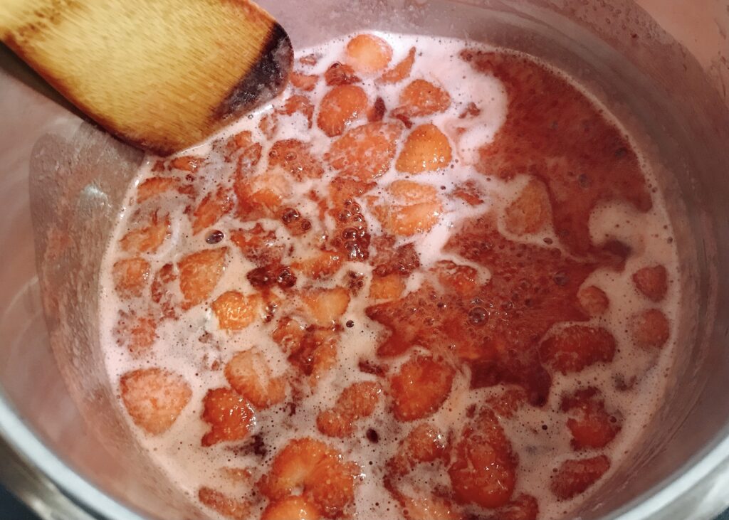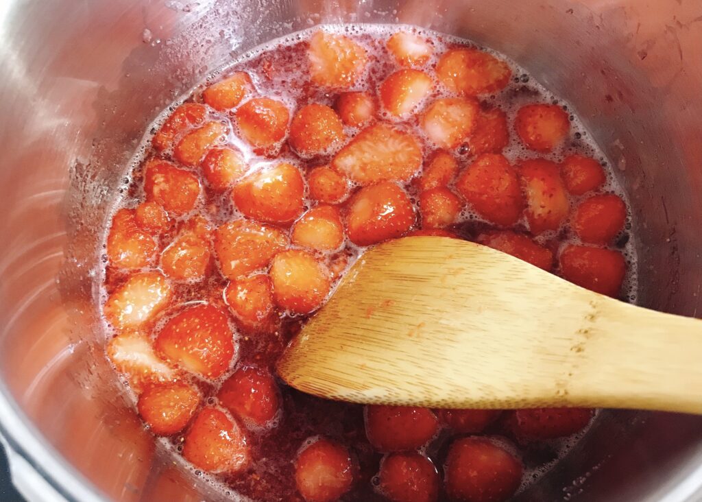 ②イチゴと砂糖は火にかける前にしっかり混ぜる。