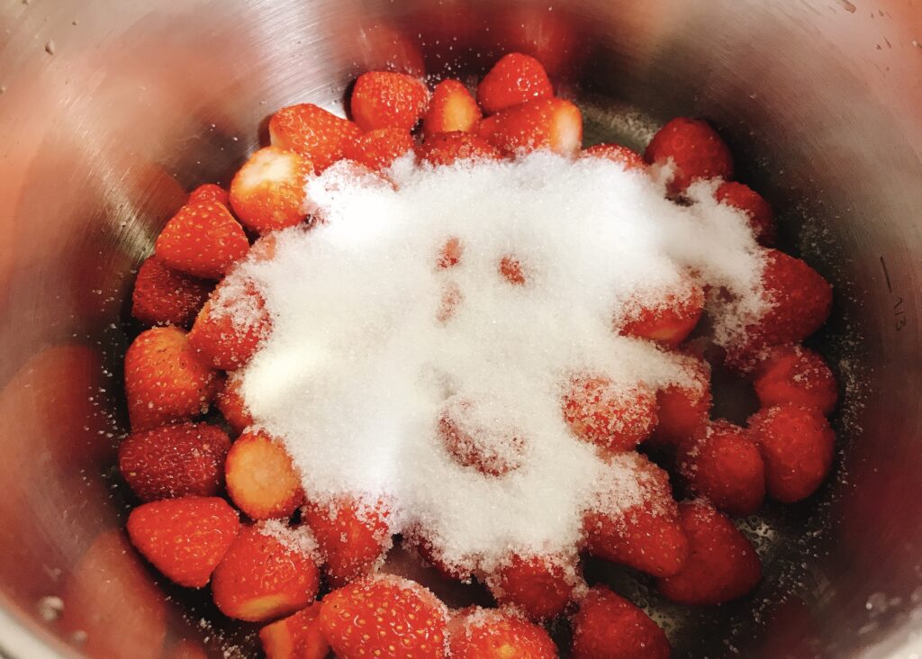 ①洗ってヘタを取ったイチゴと砂糖を鍋に投入