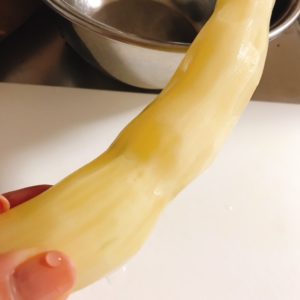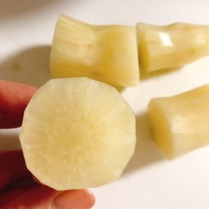 切った断面は透明感があるサツマイモかな?繊維の感じは大根みたいですね。