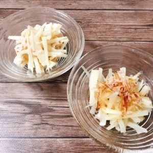 水を切ったら器に盛って食べます。青じそドレッシングとおかかのせ&ツナマヨポン酢和えにしました。