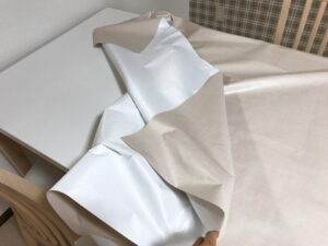 イオンの生活雑貨用品売り場で購入したベージュカラーの切り売りクロス2,176円(税込み)を掛けていきます。真っ白なテーブルに重ねると色味の違いがよく分かります。