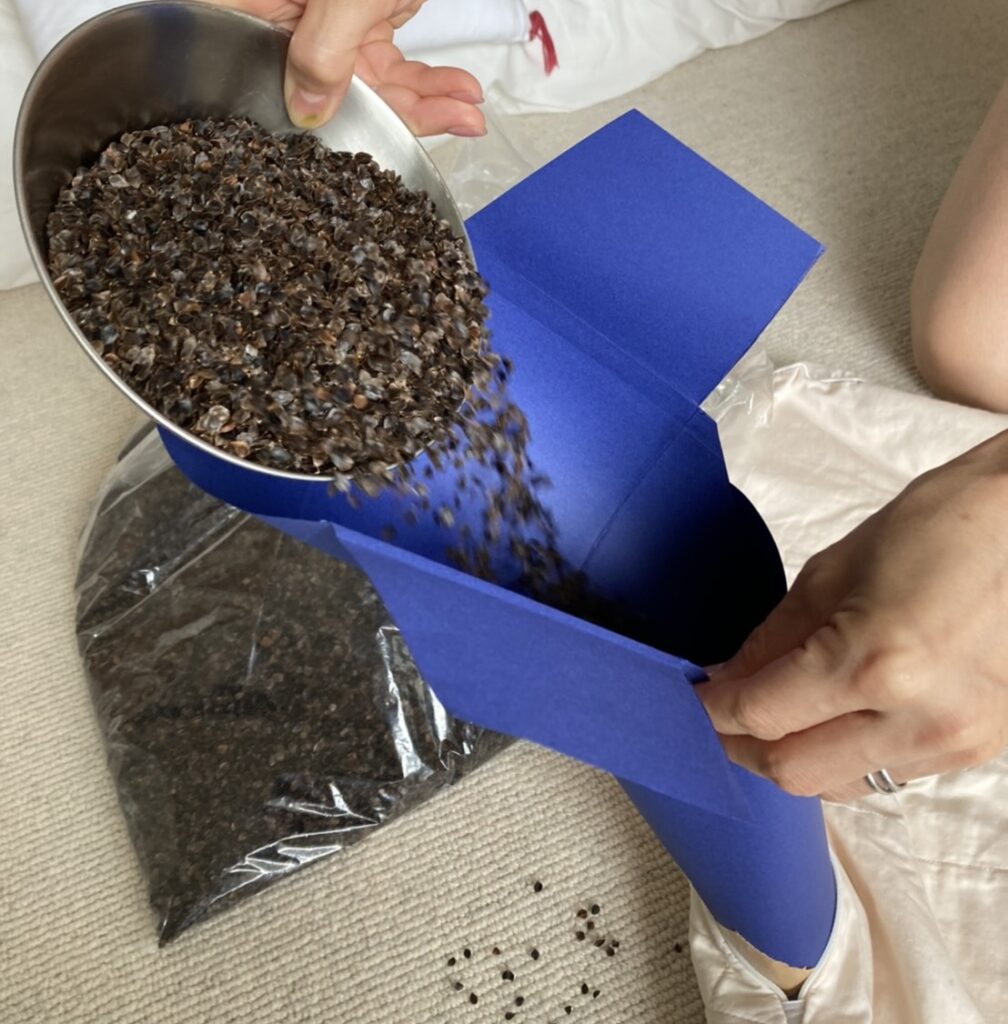 私は適当な厚紙をろうと状に丸めて、ボウルを使ってそばがらをすくって流し入れます。