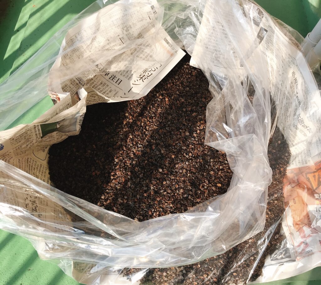 前回は新聞紙を敷いてそば殻を取り出しましたが想像以上に散らかったので45Lサイズのポリ袋の中で出すのが安全でおススメです。